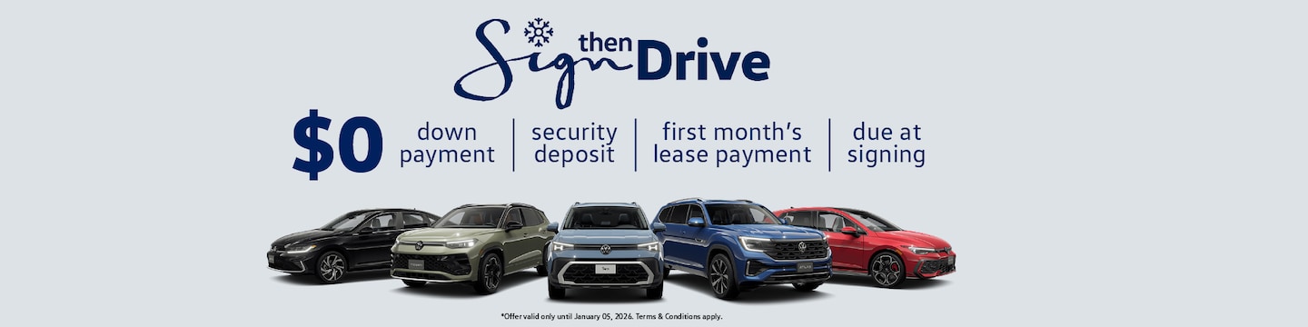 Volkswagen of Macon's "Sign Then Drive" Event makes leasing simple and stress-free. Starting each year in November and running through the New Year, this limited-time event lets you get behind the wheel of your favorite Volkswagen - whether it's a sporty Jetta or a versatile Tiguan - with $0 down, $0 due at signing, and $0 first month's payment.