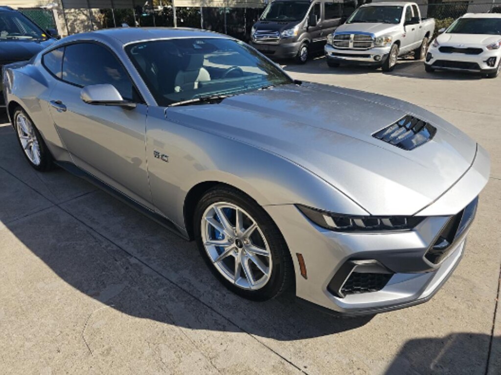 ONE OWNER, CLEAN CARFAX, LEATHER, REARVIEW CAMERA, BLIND SPOT MONITOR, NAVIGATION, HEATED SEATS, SMARTPHONE INTEGRATION, Active Valve Performance Exhaust, Auto High-beam Headlights, B&O Sound System by Bang & Olufsen, Brake assist, Climate Controlled Heated/Cooled Front Seats, Connected Built-In Navigation, Equipment Group 401A High Package, Exterior Parking Camera Rear, Ford Co-Pilot360 Assist+, Grabber Blue Brake Calipers w/White Logo, Heated front seats, Illuminated Door-Sill Scuff Plates, Leather-Trimmed Bucket Seats w/Color Accents, Memory Driver Seat & Mirrors, Navigation System, Pre-Collision Assist w/Automatic Emergency Braking, Remote keyless entry, Security Package, Steering wheel mounted audio controls. **OUR BEST PRICE UPFRONT, EVERYDAY AND FOR EVERYONE. See Dealer for details.** CARFAX One-Owner. Iconic Silver Metallic 2024 Ford Mustang GT Premium RWD 10-Speed Automatic 5.0L V8 Ti-VCT
